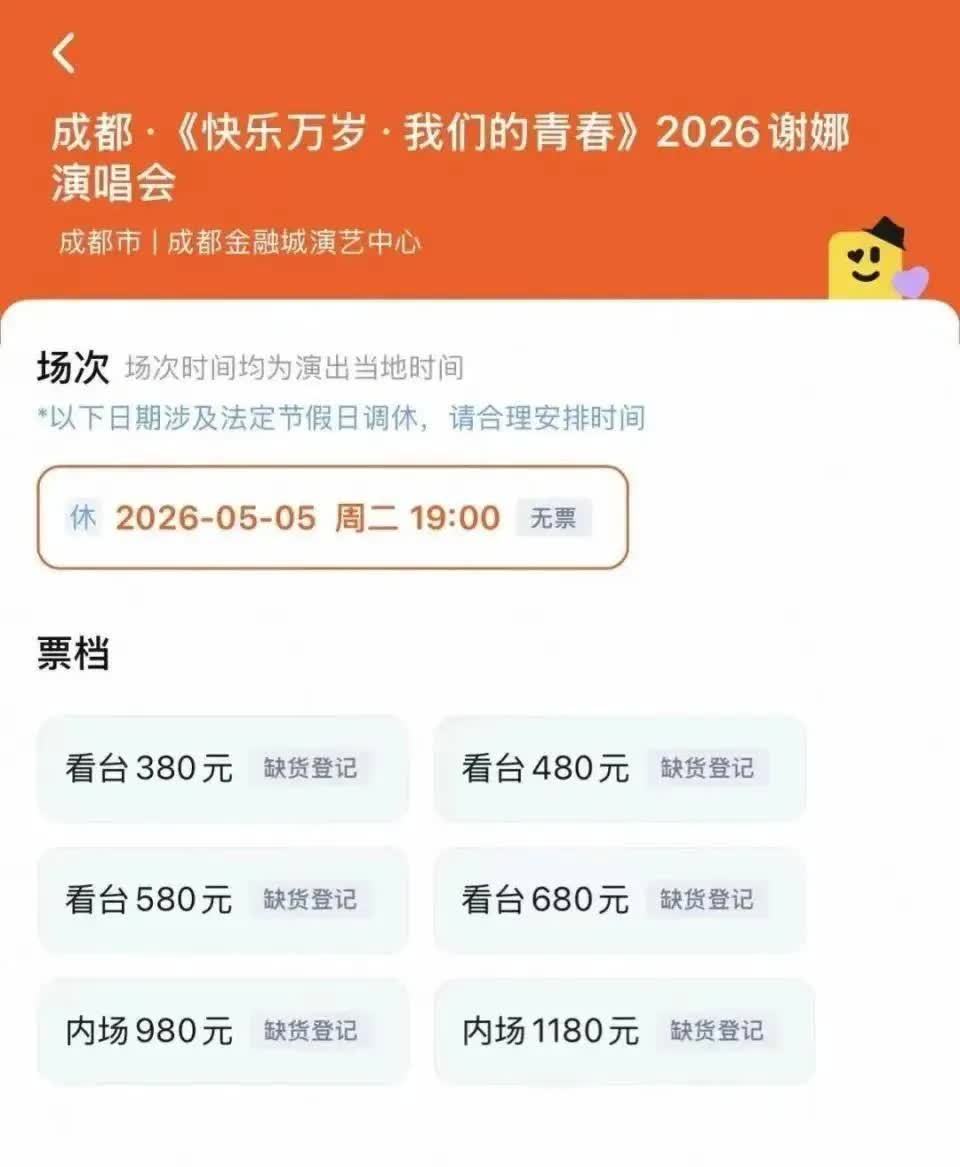 4月15日下午2点,谢娜个人演唱会成都站门票正式开启售卖。仅仅过去8分钟,谢娜便在社交媒体发文称:"哎呀,秒!我手抖第一次碰到这种事儿,好慌啊"。所有档位门票瞬间售罄,这场名为"快乐万岁·我们的青春"的演出,以极为直接的方式彰显出了其惊人的市场号召力。