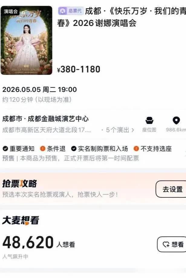 开票前的预约数据已然预示了此次的盛况。自4月11日官宣以来,大麦平台"想看"人数迅速突破6.2万,甚至有报道表明这一数字一度冲至11.1万。面对成都金融城演艺中心1.2万个座位,供需比达到了令人咋舌的5:1。票价分为380元至1180元六档,其中380元的最低档位被普遍预估将"开售即秒光",最终结果证实了这一预测。